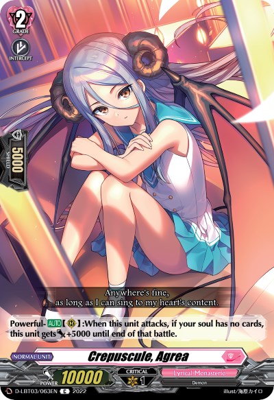 Rarity: Common Set Name: Lyrical Monasterio: Summertime Memories! Card Number: D-LBT03/063EN Release Date: 2022-11-11 Unit: Normal Grade: 2 Skill Icon: Intercept Nation: Lyrical Monasterio Race: Demon...