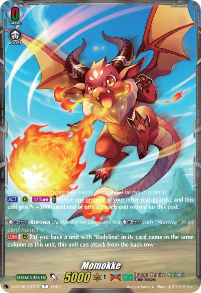 (This represents a Momokke token, and cannot be put in a deck) [ACT](RC)[1/turn]:[COST][Retire one or more of your other rear-guards], and this unit gets [Power] +5000 until end of turn for each unit retired for this cost. [Glitter]-Rorowa (Active if your vanguard is a [Glitter] with “Rorowa” in its card name) [CONT](RC):If you have a unit with "Radylina" in its card name in the same column as this unit, this unit can attack from the back row